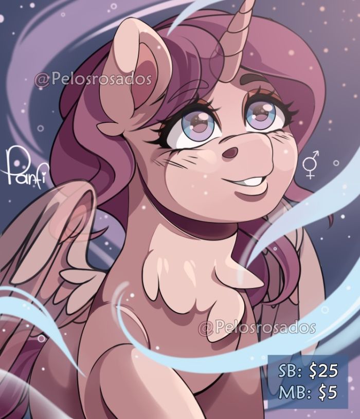 SB: $25 MB: $5 Terms & Conditions • I can draw [Unicorns / Pegasus / Alicorns / Earth pony / Bat pony] • Other Species (+ Extra Payment ) ————————————— ♡ ♡ ♡ ♡ ———————————— • I will only contact the customer when the auction is completely over!!! • You have 2 days to send the payment after the auction ends • During the process, I will send progress of the drawing to the respective client. • The final result will be sent by email [Higher Quality] ————————————— ♡ ♡ ♡ ♡ ———————————— • Contact via CRM or email • Payment via (Only) Paypal • Deadline: 2 - 3 weeks ————————————— ♡ ♡ ♡ ♡ ———————————— ★ pelosrosados's reputation: https://loot.commishes.com/user/profile/pelosrosados/ ————————————— ♡ ♡ ♡ ♡ ———————————— Twitter: https://www.twitter.com/pelosrosados Carrd: https://pelosrosados.carrd.co ♡ Have a nice day! ♡