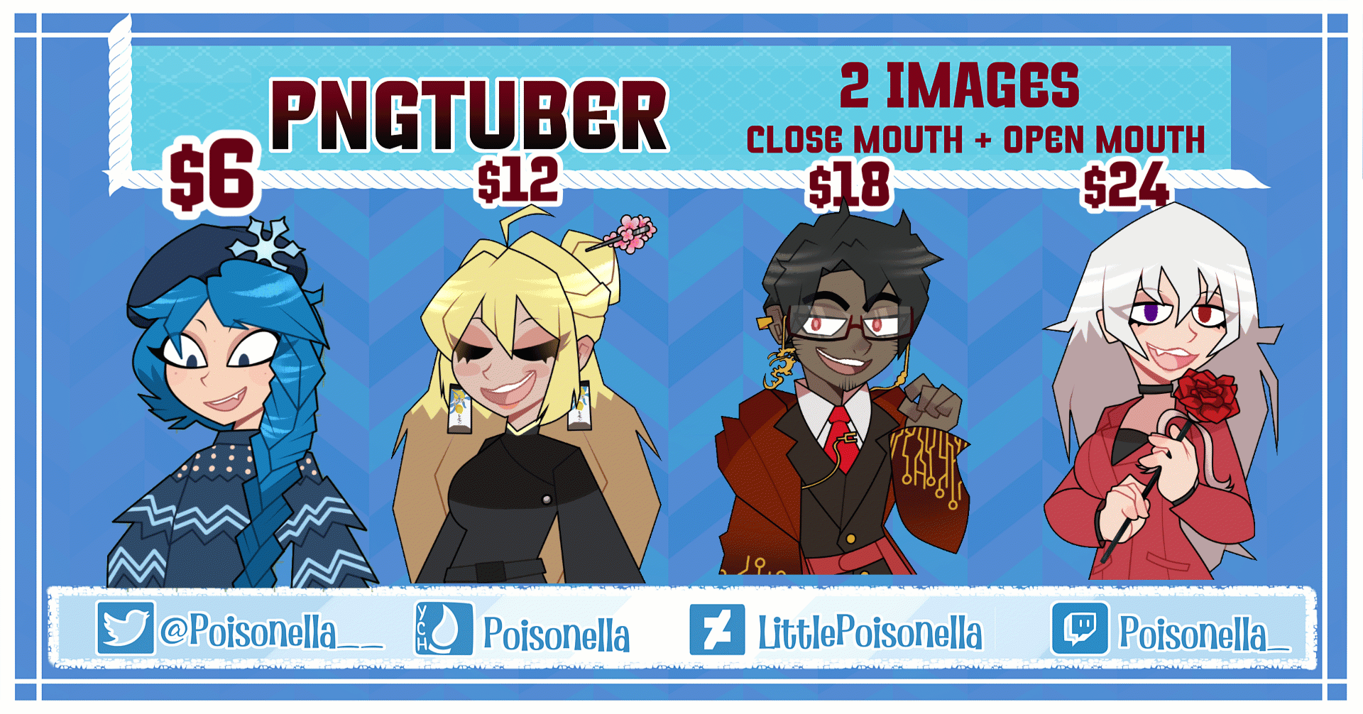 ╭─────────────· · · ✦ │ ʚ🌙ɞ 𝐇𝐞𝐲𝐲! ╰─────────────· · · ✦ ⭑ I’m in the tough position of offering custom pngtubers on this cartoony style for 6𝐔𝐒𝐃 instead of 𝟏𝟎𝐔𝐒𝐃 I’m currently in a vulnerable moment . ✦SB✦ ♦ $ 6 USD Open & Close Mouth (Its on all the stages!) ✦MB✦ ♦ 1$ USD AUTOBUYS SYSTEM ✦1th AB✦ ♦$ 12 USD +2 Blink images ✦2nd AB✦ ♦$ 18 USD +2 Blink images + 1 Hand Up (With or Without Object) ✦3rd AB✦ ♦$ 24 USD +2 Blink images + 2 Hands Up (With or Without Object) ✦4th SUPER ULTIMATE AB✦ ♦$ 36 USD +2 Blink images + 2 Hands Up (With or Without Object) + 1 Emotion or +2 Blink images + 2 Emotion Diferent Emotion 12$+ I accept PayPal only. TOS ✤ Don't repost, copy, edit, sell or use without my permission. ✤ Total payment before start ✤ I'm allowed to post the commision results on social media but can tell me if you don't want that. ✤Wait time depends on the complexity of the commission. Typically are completed between 2 days to 2 weeks depending the amounth. ✤I do not refunds. █ ▇ Thank you so much for your interest, I look forward to working with you! ▇ █ It will be delivered on Drive Folder with the following format and sizes 2 Images 1000px x 1100px ↳ 𖥔 𝐀𝐧𝐲 𝐬𝐩𝐞𝐜𝐢𝐞𝐬 𝐢𝐬 𝐯𝐚𝐥𝐢𝐝 ───────────────✧ ♡ Thank you for reading ♡ ───────────────✧ -------------- __ Please, read this You can order directly here https://crm.commishes.com/task/create/Poisonella/ The link to pay is given once you open the commission Other Sites https://www.deviantart.com/littlepoisonella https://twitter.com/Poisonella__ ❤ my 15k precious https://www.youtube.com/@Poisonella Doubts and questions: Discord: Poisonella Me testimonial https://loot.commishes.com/testimonial/on/Poisonella/ My Portfolio https://portfolio.commishes.com/user/Poisonella/