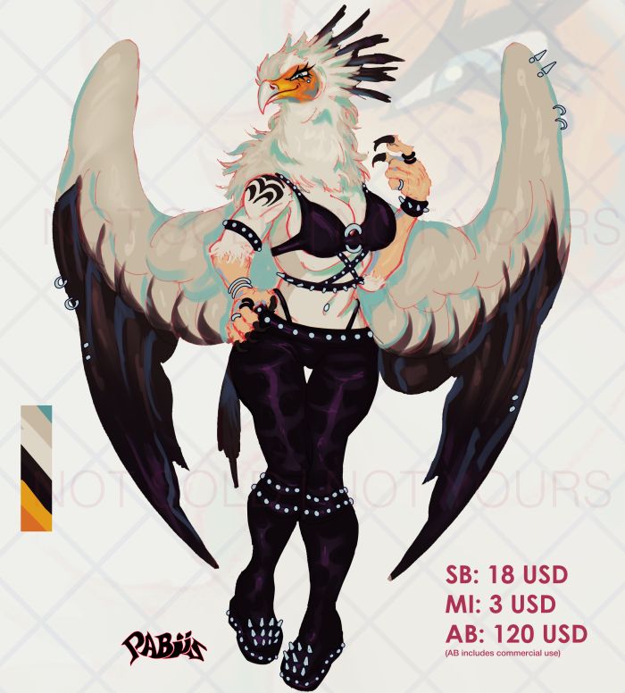 SB: 18 USD MI: 3 USD AB: 120 USD Payment via: PayPal (invoice) - AB includes commercial use - Can transfer adopt via ToyHouse, Gmail, or any social media of your preference. - Buyer obtains HQ version and without background. Serious offers only. The auction winner has 24 hours to respond and complete the payment. Failure to do so will result in being blacklisted and the adoptable being relisted. Design TOS and Art examples: pabiis.carrd.co/ # THIS AUCTION IS CROSSPOSTED, ANY BID MADE BY ME IS AN EXTERNAL BID Auctions links: FB: https://www.facebook.com/pabiis.pavooss/ TH: https://toyhou.se/Pabiis/characters/folder:1602324 DA: https://www.deviantart.com/pabiis