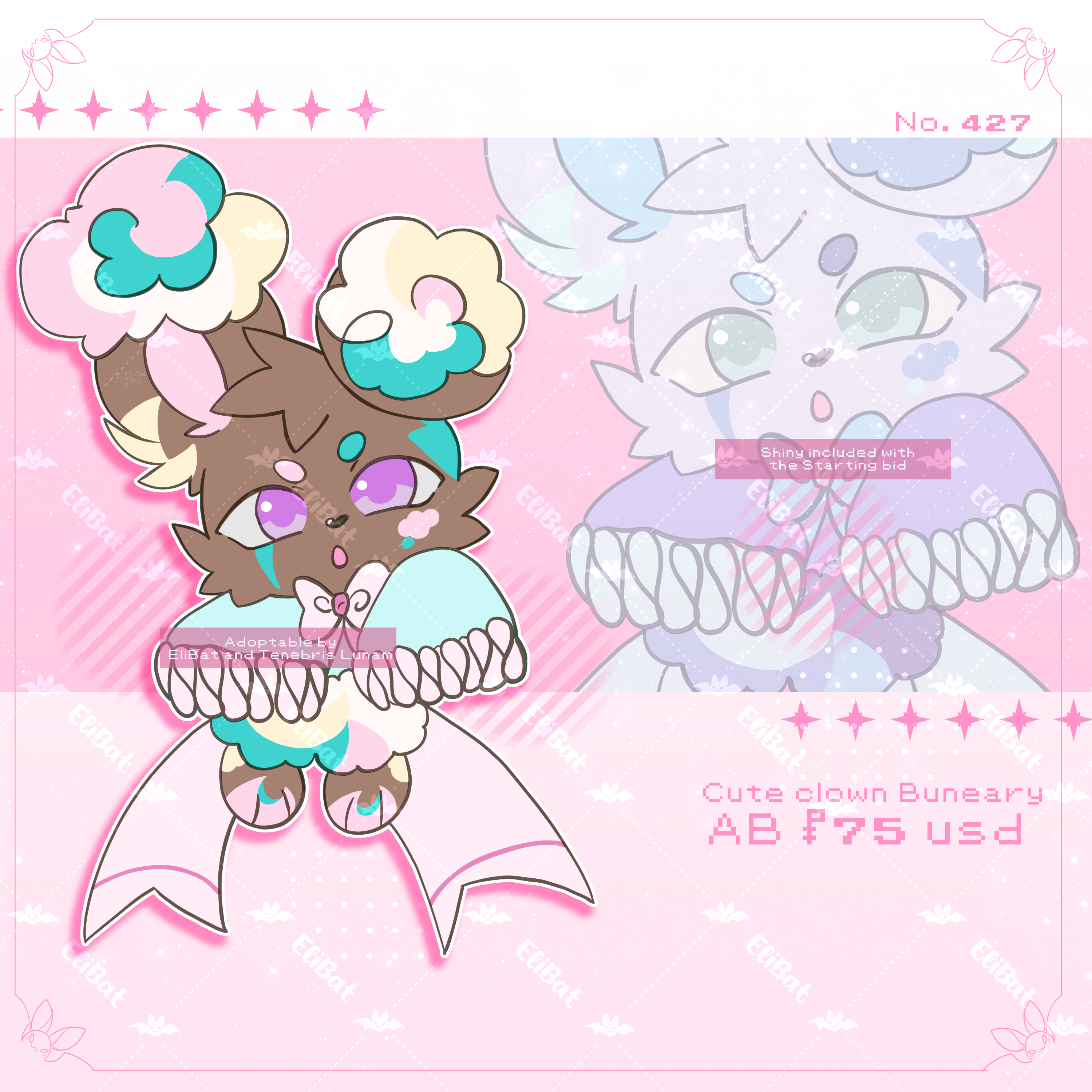 Hiii everyone~ New babies available! Collab between EliBat and Tenebris Lunam~ Make sure you read the rules and specifications on prices!~ Remember to join my discord server to be tagged when I upload more beans, as well as exclusive auctions! discord.gg/Xy6X9QUPwU And by being a Ko-fi support (of any level) you get the chance of pre-claim for a little less! *Shiny is included with the pucharse BUT having new files turned shiny will cost an adittion of $5 (addition to the total price) *TENEBRIS LUNAM AND ELIBAT'S BIDS ARE FROM OTHER SITES - DA/FA: Bid in chain/respond to previous bidder of same bean. 1. Jester Mew 2. Small Clown Bunneary 3. Clown Kirlia x Kyogre 4. Clown Princess Gardevoir Each: SB: $25 MIN: $2 AB : $75 - You'll obtain 1 Extra fullbody of the character (Either of those can be changed to the other stages if they have any, such as evolution or pre evolutions) + Icon OR Chibi AB2: $190- (Previous rewards) + Bust + Extra fullbody + free color changes or small changes + Shiny + Icon or Chibi AB3* $250 - (Previous Rewards)+ Human/Anthro/Feral Character Sheet. Sheet is of back and front view with some accessories or close ups. *AB2 AND AB3 DOES NOT OVERRIDE AB! THEY ARE ALTERNATE OPTIONS. <—— ANOTHER INFORMATION ——> Crossposted on: Deviantart: https://www.deviantart.com/tenebrislunam/art/1319419068 Furaffinity: https://www.furaffinity.net/view/64605935 RULES/TOS: https://tenebrislunam.carrd.co/#about Pokemon is owned by the Pokemon Company, Nintendo and GameFreak. We are not associated with them in any way. We own these designs. Art by EliBat and Tenebris Lunam