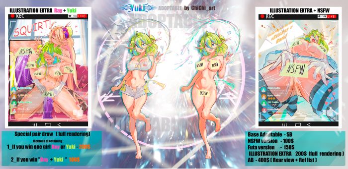 Hi! This is the new "Adopt" model, I hope you like it! :3 ♡ 😻This is a couple auction, link to her partner 😻 "RAY" 👉👉👉 https://ych.commishes.com/auction/show/5CD1J/adopt-ray-/ 👈👈👈 ❤️ SHORT DESCRIPTION!! ❤️ Her name is Yuki, she is an elf girl, her mouth is 157 centimeters long Yuki with Ray are best friends and idols, they created their own music band "Sticker" and perform their songs in the Pop style!) Yuki is the youngest in their duo, she has a kind and bright character, she is more modest and shy than Ray, but she is very cheerful and fun, she loves to play video games, sing and dance on stage! 🎵✨🪩 She has beautiful curly hair of light green with a blue tint, pinned in a bun at the back and ornaments in the form of cute hearts. 😍 She likes to wear loose or beautiful clothes, usually a little transparent), as well as short skirts and long stockings :3 Yuki has a favorite hobby: Video games! She's a big fan of complex turn-based games with interesting plots, and one of her favorite games is "Baldur's Gate 3" and other RPGs. She often spends her free time sitting in front of her computer screen! 🤩 She also loves playing dating simulators. 😏 In romantic simulators, she always seduces all the game characters she can! Then, at night, she imagines herself as her character from the game and wakes up completely wet from such dreams. 💖😍 Yuki has a dream to go with Ray to a fantasy RPG gathering somewhere in a beautiful fairy-tale forest and turn a normal game event into a real hot and passionate orgy !!! 💖😍😈 She loves to have passionate sex with Ray, to share everything that happens with her, especially after their performances! and during online broadcasts 🤩😏 ===Yuki and Ray === These two elves are best friends 👩❤️👩 and even more 😻❤️🔥 They are a couple who always share everything together!) Common feelings, love, fun and guys and girls!!! 😻🙈😏 ———————————————— Yuki and Ray are musicians 😏🎶🎸 They created their own music group «Sticker» and they have a lot of fans 🤩❤️🔥🙈 They perform live on stage!) But their performances are always with a fire ❤️🔥🔥🔥🔥😏 (There are some scenes from their concerts on additional illustrations 😏🙈😻) ——————————— These two elves have magical power 🪄 Yuki knows how to control liquids 💧 she often uses it to perform on stage 😏😻 Wagging the moisture in the air, she can use it as she wants!) But the level of her control depends on her mood 🙈😻 and desire to be loved 😏 Ray, on the contrary, controls the destructive forces of fire ❤️🔥🔥!!! And, as a rule, she is responsible for everything bright and sexy at their performances 😏 Can control the temperature of her body and when it is on a spiritual rise or incredibly sexually excited! Even she can turn into a fiery beast 🔥😈🔥 (in this state she doesn’t control herself well, and as a rule she has to apologize for her jokes to Yuki in the morning 😭🥰) Fetishes Yuki : 1_ Yuki - Always inserts a special vibrator into her pussy before going on stage, which reacts to donations from her fans, and everyone knows this 😈 She loves it when, at an unexpected moment during a performance, her "toy" goes crazy and makes her cum profusely, drenching everything around her! 🔥 Yuki's fans absolutely adore the "wet" moments from her concerts, and they are wildly popular!!! When she cums directly into the camera, splashing everything, while still trying to continue performing!!!💋💧🍆 (shown in the additional picture on the right) 🍆 2_ Yuki is an exhibitionist. She likes to wear transparent clothes that barely cover anything, and she loves having everyone's eyes on her. Sometimes, Yuki even paints her underwear on her body with special paint and walks around the streets completely naked 👙 3_ She loves being dominated and being told what she is ... 🤩 Rey often comes up with various sexual challenges for her 4_ She can control liquids and make them obey her) She often does this when she takes a hot bath, and sometimes she can even turn the cum inside her pussy into a dildo if there is enough of it and she continues to play with it !!! Ray loves it when Yuki does this to her body and makes her cum multiple times in a row !!!!! 😈🔥🔥🔥 5_ Sex broadcasts for their fans!!! where they perform various tests that their fans ask them to do! Sometimes they even invite the biggest and most important members to participate in their performances and have an orgy!!! THEY ARE ALWAYS THIRSTY 🔥 🍓 (shown in the additional picture on the left) 🍓 • SB- files are in high resolution • NSFW -$100 • FUTA version $150 - •ILLUSTRATION EXTRA $200: a fully drawn version! (Also, you can change this art to the FUTA version!) + version NSFW If you want, you can also change the illustration to another one by selecting from my "YCH" I have quite a lot of them 55+ I will send you a link after winning the auction 🥰 Special paired drawing of "Trixie and Remia" (shown on the left) there are several options to get it. 🥰 🍓1_You have to win the auction with one of the girls and then I will draw it for you for an additional fee of $200 🍌 2_You have to win the auctions of both characters of "Luna and Haruka" and then I will make it with a discount, the price will be $100 🍆3_If both auction winners want to get a common drawing, they can pay $200 together, for example, in half, and then I will make a drawing for both winners ⭐AB $400 (Reat view + Ref list) Minor changes in the design are also possible (color palette, clothing details) Also, if you want, I can create an alternative outfit for your character for $50 in addition to the existing one (¬‿¬) If the winner does not respond within 24 hours of the auction ending, the character will receive the second highest bid. ! Pay by