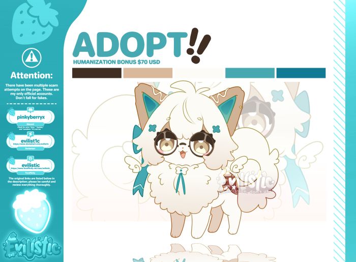 [Read the description] SB: $35 MI: $2 AB: $200 Only PayPal $35 USD: Adoptable in high quality $70 USD: Adoptable in high quality + Humanized version [or chibi] $100 USD: Special Combo Bundle! Get the Feral Illustration + Humanoid Version + Chibi Version Ko-fi: https://ko-fi.com/evilistic π¨ ATTENTION π¨ There have been recent scam attempts involving fake accounts pretending to be me. Please read carefully. Scam Tactic You Must Be Aware Of Scammers have been using a very specific strategy to trick clients: They place a bid or take the AB (Auto-Buy) over real clients. While the artist is trying to contact the supposed βwinnerβ (the scammer), the scammer rushes to message the real client claiming: That someone made a fake offer Asking if the client is still interested in the service This is NOT me. These tactics are meant to confuse and pressure you. I Will NEVER: Contact you through any platform other than my official accounts Ask you to send money to any PayPal email address Message you privately offering deals or asking for information What YOU Should Do Be cautious of any unexpected or suspicious messages. Always check: Account creation date Post history Real activity If you receive external contact, message me through my official YCH Commishes profile to confirm authenticity. If something feels off: doubt it. Your safety comes first. If you find any suspicious account pretending to be me, please inform me so I can report it. π¨Final Reminderπ¨ Scam methods can change at any moment. Stay alert and be cautious with any suspicious account or message. ββ§*ββββοΉ€*Extra Bonus:*οΉ₯ ββββ*β§β Modifications: Small edits to the original design or alternate versions (such as scars, outfit swaps, minor redesigns) [+ $10β20 USD depending on complexity] Accessories: Add items like jewelry, hats, glasses, weapons, or themed props to your character [+ $5β15 USD each] Shiny Version: A rare, alternate color palette of your character (like a special shiny form!) [+ $15 USD] Custom Icon: Perfect for social media, with a themed and expressive background [+ $25 USD] Expression [HeadShot]: +$15 USD Three pack of Expressions [HeadShot]: +$35 USD (Happy, sad, angry, surprised, kissing, winking, etc). β§β‘β§ββββ§β‘β§ββββ§β‘β§ Reviews: https://loot.commishes.com/user/profile/Evilistic/ β§β‘β§ββββ§β‘β§ββββ§β‘β§ Payment must be made within 24 hours after the auction ends!! After payment, you will get all rights to it without watermarks. Check your money wallet before bidding. Unwatermarked version will be sent after payment. It is allowed to sell, give away, or exchange between people. No refunds. Waiting list: https://trello.com/b/Z9Dvih7K/β¨-waiting-list-β¨ Furaffinity: https://www.furaffinity.net/user/evilistic Deviantart: https://www.deviantart.com/evilist1c DISCORD: pinkyberryx