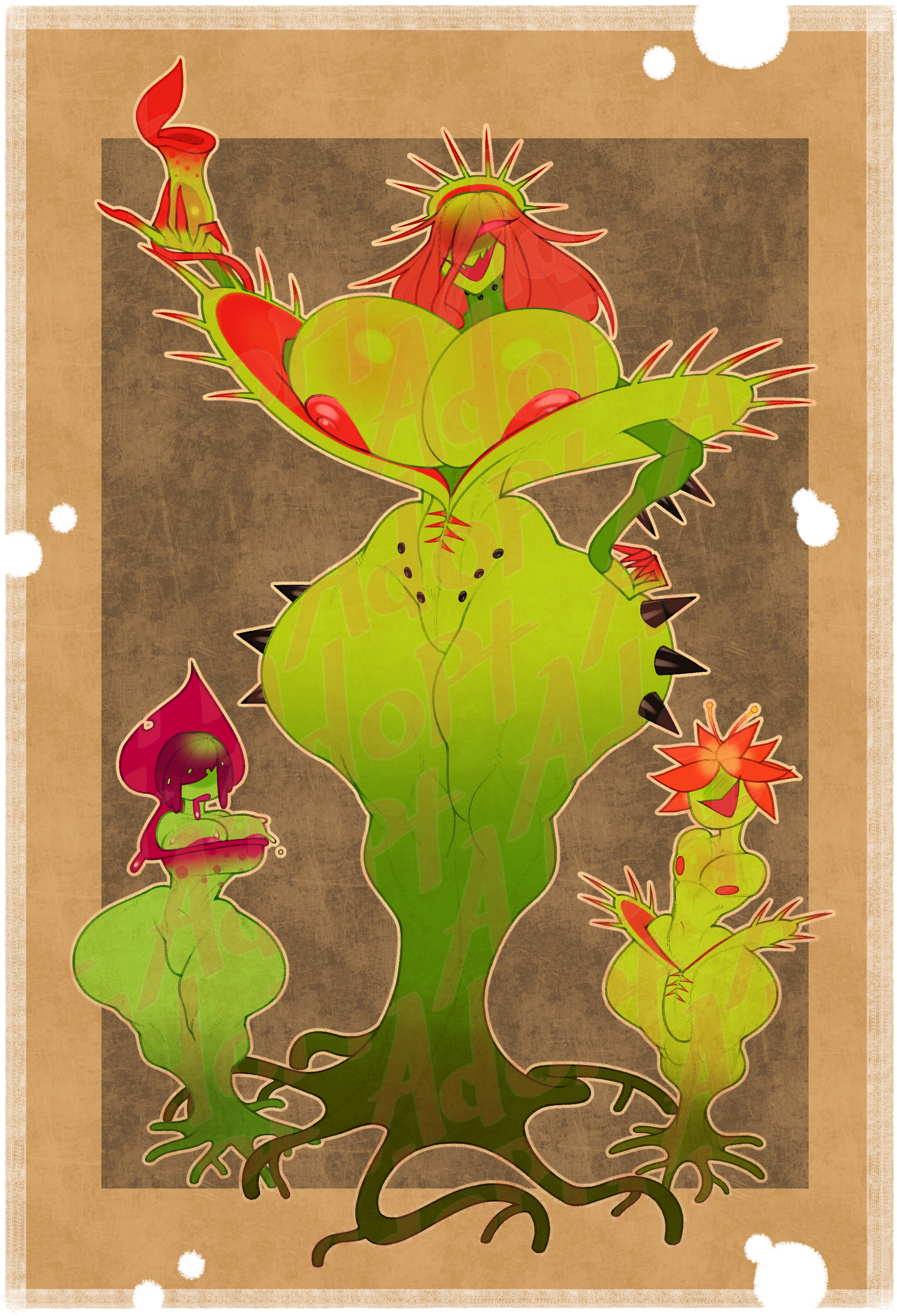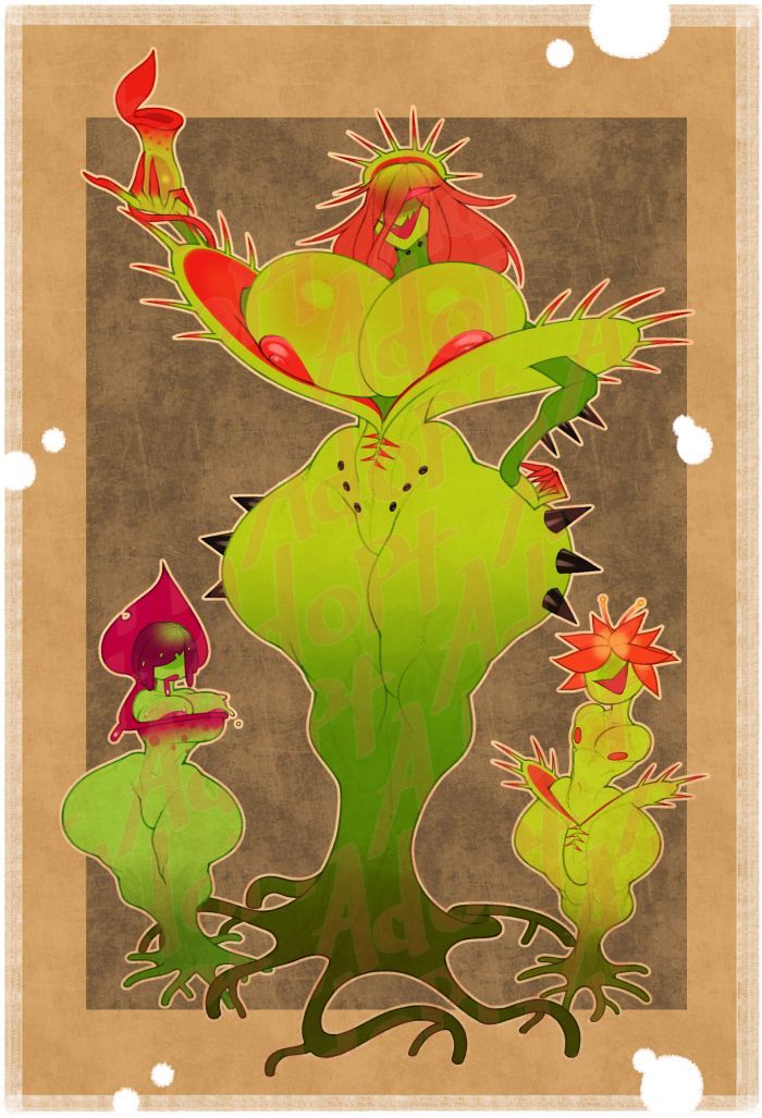 Within the Dungeon of Alluring Lush lurks the Verdant Temptress, the ruling entity of the dungeon. She lures adventurers deep into her domain with tempting desires of luxury and debauchery so that she and her minions can feed off their life force. Attractive as she may be, she's a deceitful and dangerous monster. Alongside her minions, spawned from the seeds that adorn her body, she will pose a great threat to any would be adventurer who dare stumble into her domain