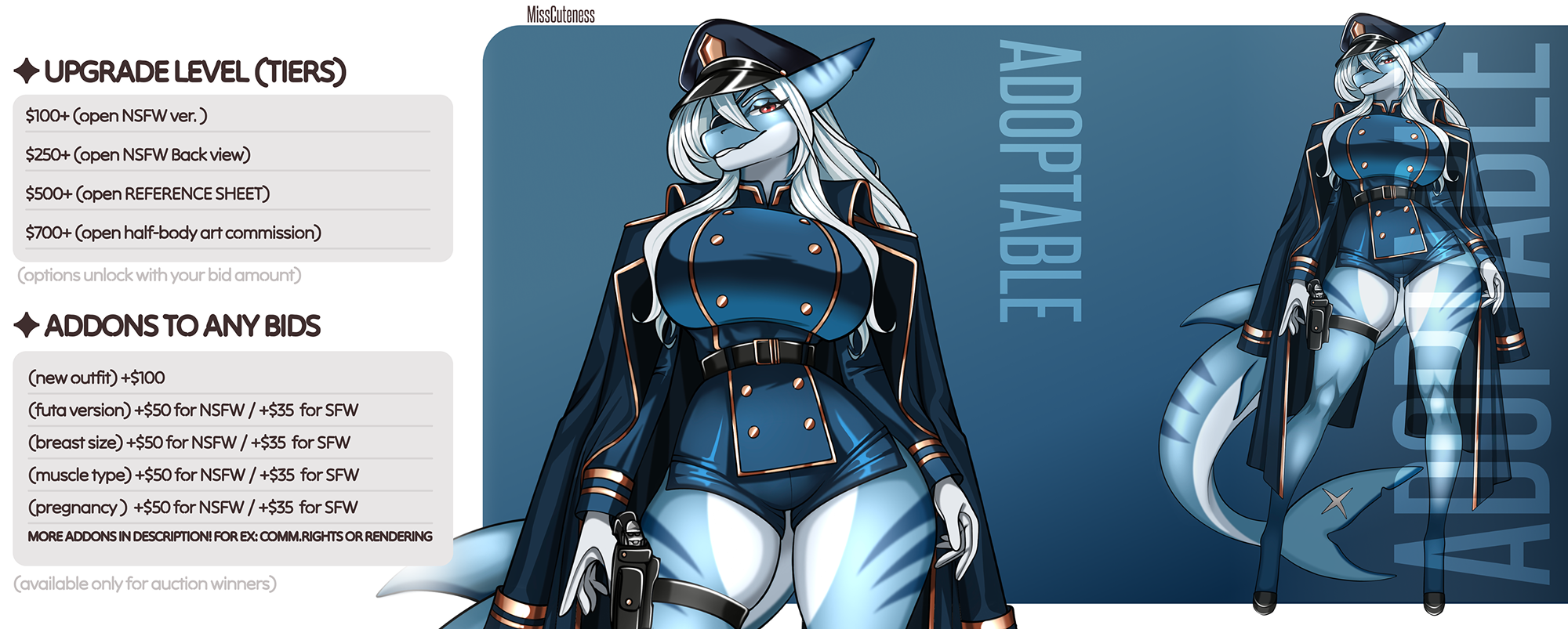 ⚠️ Scammer warning If you win, and we haven’t spoken personally before, I will contact you only on YCH Commishes. Auction also here: https://www.furaffinity.net/view/64662311 --------------------------------✧✧✧✧✧-------------------------------- 𝐒𝐁 - $𝟔𝟎 𝐌𝐁 -$𝟏𝟎 𝐀𝐁 - $𝟗𝟎𝟎 𝐔𝐏𝐆𝐑𝐀𝐃𝐄 𝐇𝐄𝐑 𝐋𝐕𝐋 if your bid more : ◆ $100 + and open front view NSFW ver. ◆ $250+ and open NSFW Back view ◆ $500+ and open REFERENCE SHEET Examples: https://www.furaffinity.net/gallery/misscuteness/folder/1395511/FULL-REFERENCE-COMPLETED ◆ $700+ and open half-body ART COMMISSION Examples: https://www.furaffinity.net/gallery/misscuteness/folder/1395514/HALF-BODY ◆ AB - we can discuss your wishes individually! ^-^ --------------------------------✧✧✧✧✧-------------------------------- 𝐅𝐎𝐑 𝐖𝐈𝐍𝐍𝐄𝐑: 🌟 𝗔𝗗𝗗-𝗼𝗻𝘀 ◆ +$50 and get Futanari version (for only NSFW) ◆ +$50 and get Pregnant version (for only NSFW) ◆ +$50 and get Сhange body/muscle type (for only NSFW) ◆ +$50 and get Change breast size (for only NSFW) Want 𝗰𝗵𝗮𝗻𝗴𝗲𝘀 𝗳𝗼𝗿 𝘁𝗵𝗲 𝗦𝗙𝗪 version as well? ➤ No problem — it’s an additional $35 Want 𝗯𝗼𝘁𝗵 𝘃𝗲𝗿𝘀𝗶𝗼𝗻𝘀 (SFW + NSFW)? ➤ That’ll be $80 total 💎 ◆ +$100 and get New Outfit - your choice or mine if you want~ ◆ +$100 and get Color Rendering - example here - https://drive.google.com/drive/folders/1PTbhgHwqwaJp0F885kxJjlZQ-J_WTAJ1?usp=sharing ◆ +$170 and get half-body ART COMMISSION + background Examples: https://www.furaffinity.net/gallery/misscuteness/folder/1395514/half-body 𝗢𝘁𝗵𝗲𝗿 𝗔𝗗𝗗-𝗼𝗻𝘀 ◆ +$50 and get Commercial Rights ◆ +$35 and get one small Change — tattoos, change color, piercings etc. --------------------------------✧✧✧✧✧-------------------------------- 𝐓.𝐎.𝐒. - Payment plan for bids $300+ - OK - Be ready to pay. You have 24 hours to pay after the auction ends. If you don't pay, the adopt will be relisted. - No refund - If you're opting for additional levels, please be prepared for a little wait while I complete them. We'll discuss the deadlines individually - When purchasing changes or add-ons, two free revisions are included. Any additional revisions beyond that will require an extra fee. - If you’re purchasing a new outfit with high detail (such as embroidery, beads, or a large number of accessories), an additional fee may apply. - You may upload the images you acquire from me to your gallery, but always credit me as the artist - You may not erase my signature from the artworks - You may resell the adopts purchased from me, but not for more than the price you paid - You can purchase commercial rights to the artwork or character, allowing you to erase my signature, use the character for commercial purposes, and unlock the ability to resell the character at any price, including higher than the original purchase price, by prior agreement - I can use the art I've created in my portfolio with watermarks. ⭐️ 𝐑𝐞𝐯𝐢𝐞𝐰𝐬 𝐚𝐛𝐨𝐮𝐭 𝐦𝐞 https://loot.commishes.com/user/profile/MissCuteness/ 🤍 𝐈𝐟 𝐲𝐨𝐮 𝐡𝐚𝐯𝐞 𝐪𝐮𝐞𝐬𝐭𝐢𝐨𝐧𝐬 ◆FA: https://www.furaffinity.net/user/misscuteness ◆Discord: miss.cuteness Please pay attention to every character and the dot between miss and cuteness.