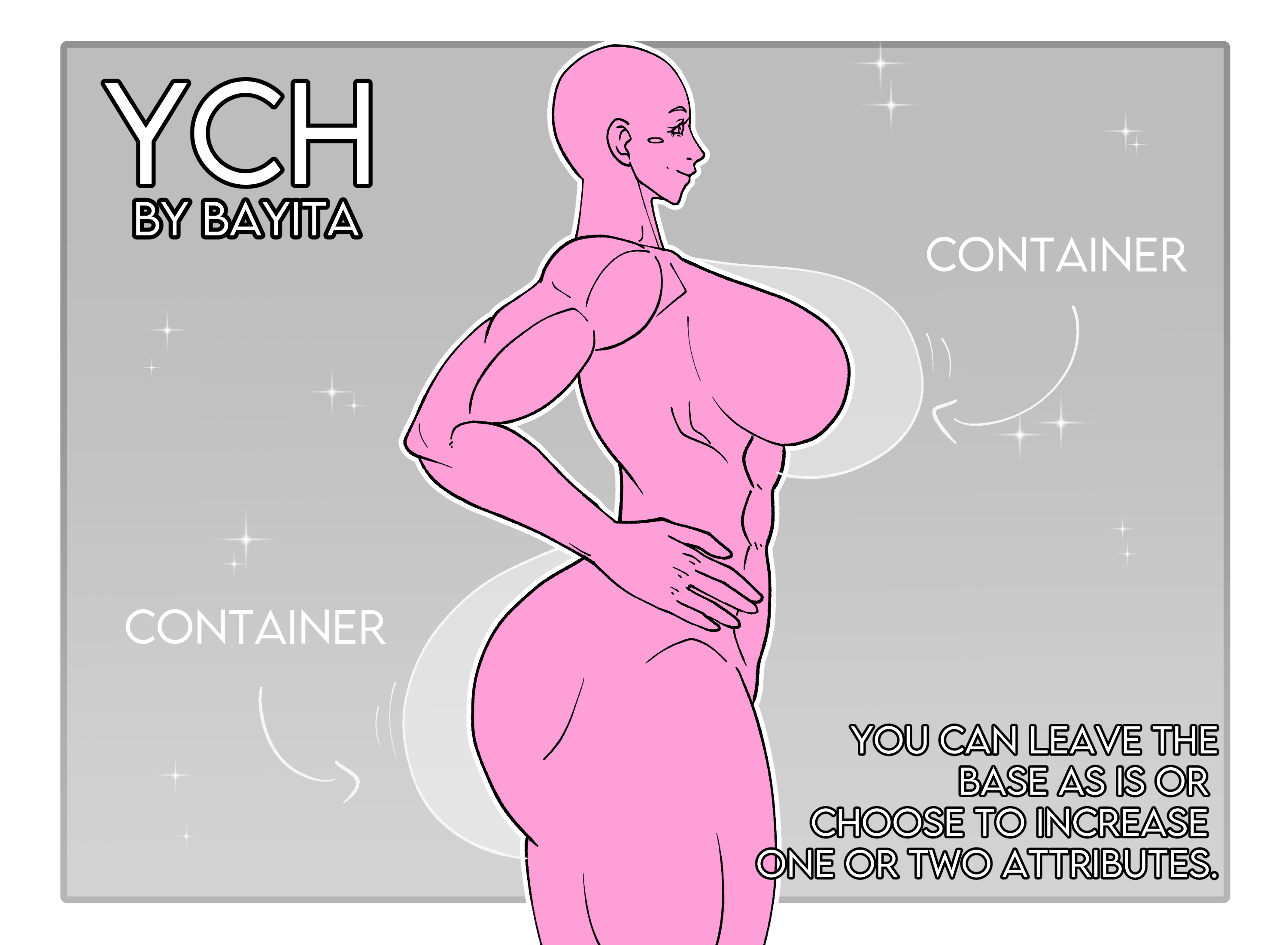 YCH - Container - Sb: $20usd Mi: $5usd AB: $70usd (Auction will close 24 hours) -- Offer levels -- +$20usd: Lineart. (https://portfolio.commishes.com/upload/show/1HHSV/) +$35usd: Lineart + flat color.(One color stage) (https://portfolio.commishes.com/upload/show/1HHST/) (https://portfolio.commishes.com/upload/show/1KLCV/) +$50usd: Full color. (Simple scenario) (https://portfolio.commishes.com/upload/show/1HHSS/) (https://portfolio.commishes.com/upload/show/1HKQC/) (https://portfolio.commishes.com/upload/show/1JIDS/) - AB: Version without clothes --I can draw-- - They can be any gender, the YCH adapts to the character. - Human, humanoid or Kemonomimi. - The bodies may have less muscle mass or be a little fatter. - Adult characters only. --Rules-- - Serious offers only, please. - Payment must be made within 24 hours after the auction ends. - No refund. - Payment through Paypal. - Estimated delivery time 5 days depending on the complexity and how quickly the advances are approved, maximum 2 week, if more time is needed we will notify you in advance. - Any offer includes commercial use. - It does not include character design. --You will receive-- - Includes a simple background. - The version with a transparent background. -- Porfolio - Devianart -- - https://portfolio.commishes.com/user/Bayita/ - https://www.deviantart.com/bayita-bl --Reviews-- - https://loot.commishes.com/user/profile/Bayita/ --You can follow my work and upcoming adoptables at-- - https://twitter.com/BL_Baya -- Discord: Bayita -- (The girls and boys in the picture are for reference only)