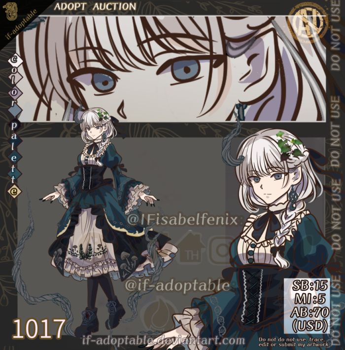 https://www.deviantart.com/if-adoptable/art/adopt-auction-1017-open-1321234893 Mycelium Spore-Witch 馃崉 An entity from the depths where light cannot reach, guardian of the forest. It controls the subterranean web of life and is said to be able to hear the secrets whispered by the earth, communicating with the creatures of the forest. Silent, ancient, and mysterious. ********************************************* sb:$15 mi: $5 ab: $70 (extra half-body drawing + commercial use ) auction ends 24 hours after first bid ,Payment on Paypal USD Rules: only serious offers ( no holds) Maximum 72 hours to make the payment or the offer will be considered cancelled. * Payment on Paypal USD *giveme credit for original design * You are free to redesign/ modify details * can resell for same price / trade or gift is fine /no refunds Only the owner is allowed to use it .not use without permission ********************* The lore is only a suggestion; its new owner decides its story.