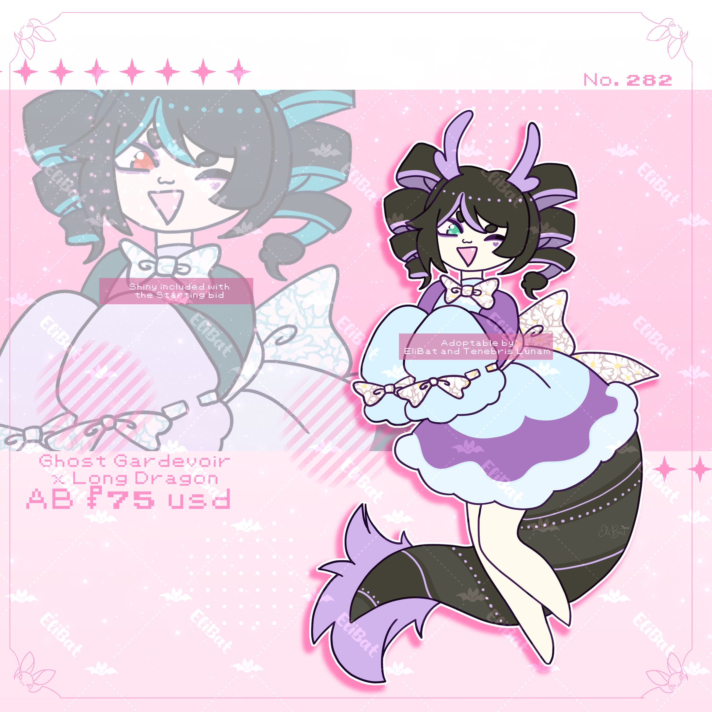 Hiii everyone~ New babies available! Collab between EliBat and Tenebris Lunam~ Make sure you read the rules and specifications on prices!~ Remember to join my discord server to be tagged when I upload more beans, as well as exclusive auctions! discord.gg/Xy6X9QUPwU And by being a Ko-fi support (of any level) you get the chance of pre-claim for a little less! *Shiny is included with the pucharse BUT having new files turned shiny will cost an adittion of $5 (addition to the total price) *TENEBRIS LUNAM AND ELIBAT'S BIDS ARE FROM OTHER SITES - DA/FA: Bid in chain/respond to previous bidder of same bean. 1. Ghostie Gardevoir x Long Dragon 2. Eevee x Shinx x Mew 3. Sylveon x Absol 4. Tiger Mewtwo Each: SB: $25 MIN: $2 AB : $75 - You'll obtain 1 Extra fullbody of the character (Either of those can be changed to the other stages if they have any, such as evolution or pre evolutions) + Icon OR Chibi AB2: $190- (Previous rewards) + Bust + Extra fullbody + free color changes or small changes + Shiny + Icon or Chibi AB3* $250 - (Previous Rewards)+ Human/Anthro/Feral Character Sheet. Sheet is of back and front view with some accessories or close ups. *AB2 AND AB3 DOES NOT OVERRIDE AB! THEY ARE ALTERNATE OPTIONS. <—— ANOTHER INFORMATION ——> Crossposted on: Deviantart: https://www.deviantart.com/tenebrislunam/art/1322932756 Furaffinity: https://www.furaffinity.net/view/64706550/ RULES/TOS: https://tenebrislunam.carrd.co/#about Pokemon is owned by the Pokemon Company, Nintendo and GameFreak. We are not associated with them in any way. We own these designs. Art by EliBat and Tenebris Lunam