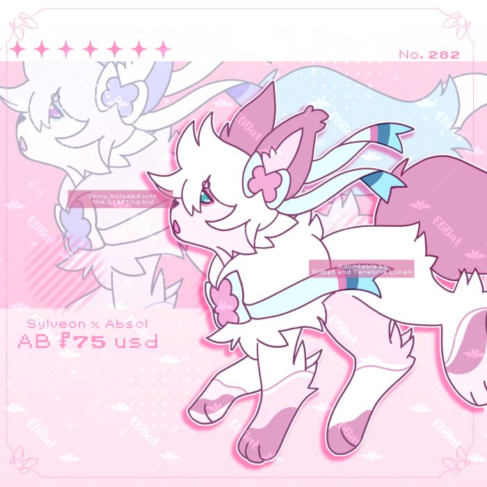 Hiii everyone~ New babies available! Collab between EliBat and Tenebris Lunam~ Make sure you read the rules and specifications on prices!~ Remember to join my discord server to be tagged when I upload more beans, as well as exclusive auctions! discord.gg/Xy6X9QUPwU And by being a Ko-fi support (of any level) you get the chance of pre-claim for a little less! *Shiny is included with the pucharse BUT having new files turned shiny will cost an adittion of $5 (addition to the total price) *TENEBRIS LUNAM AND ELIBAT'S BIDS ARE FROM OTHER SITES - DA/FA: Bid in chain/respond to previous bidder of same bean. 1. Ghostie Gardevoir x Long Dragon 2. Eevee x Shinx x Mew 3. Sylveon x Absol 4. Tiger Mewtwo Each: SB: $25 MIN: $2 AB : $75 - You'll obtain 1 Extra fullbody of the character (Either of those can be changed to the other stages if they have any, such as evolution or pre evolutions) + Icon OR Chibi AB2: $190- (Previous rewards) + Bust + Extra fullbody + free color changes or small changes + Shiny + Icon or Chibi AB3* $250 - (Previous Rewards)+ Human/Anthro/Feral Character Sheet. Sheet is of back and front view with some accessories or close ups. *AB2 AND AB3 DOES NOT OVERRIDE AB! THEY ARE ALTERNATE OPTIONS. <—— ANOTHER INFORMATION ——> Crossposted on: Deviantart: https://www.deviantart.com/tenebrislunam/art/1322932756 Furaffinity: https://www.furaffinity.net/view/64706550/ RULES/TOS: https://tenebrislunam.carrd.co/#about Pokemon is owned by the Pokemon Company, Nintendo and GameFreak. We are not associated with them in any way. We own these designs. Art by EliBat and Tenebris Lunam