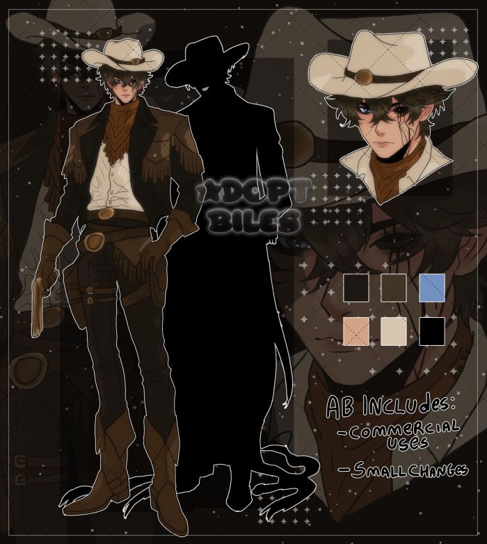 payment via paypal! i will transfer the adopt via Toyhou.se or by email, whichever you prefer! AB includes commercial use + small changes! AB payment plans: I can hold the Adopt for up to 2 weeks so you can pay for it if you wish after payment you will receive png versions of adopt (without watermark) Serious bids only, please! Bids placed by me are updates of bids made on cross postings: on deviantart: https://www.deviantart.com/makihiro/art/OPEN-CURSED-COWBOY-ADOPT-1323172558 on toyhouse: https://toyhou.se/38887131.open-cursed-cowboy for custom commissions: https://vgen.co/biles blacklist/t.o.u: https://toyhou.se/~bulletins/1217997.adoptable-tou-blacklist contact me: DA: makihiro TH: biles Vgen: biles YCH: biles Discord (long response time): hiroriki /!\ I use ONLY the sites mentioned above, be careful of scams/!\ T.O.U: 1.No refunds. 2. The buyer may resell it for the same price they paid (if no additional artwork has been added). 3. Only BID to pick up the adopt if you really are interested, If payment isn't made within 42 hours, the adopt will be available for other buyers again. If I don't get a response within 24 hours of the first message, it will also be open again. 4. The buyer is free to modify or add to the design, as long as the original artwork remains unchanged. 5. The adopt can be used for any personal purpose; commercial use is only allowed if it has been paid for.