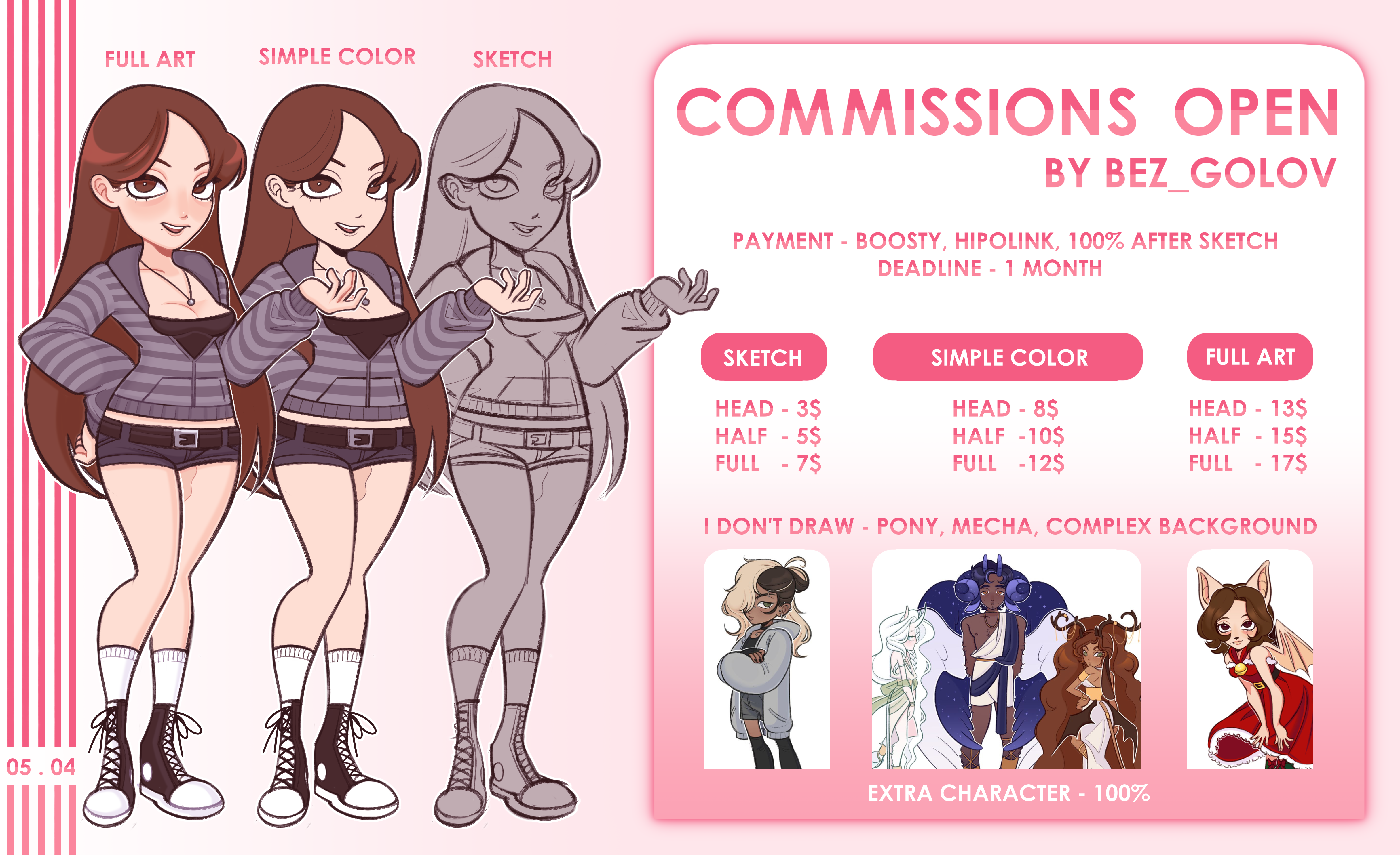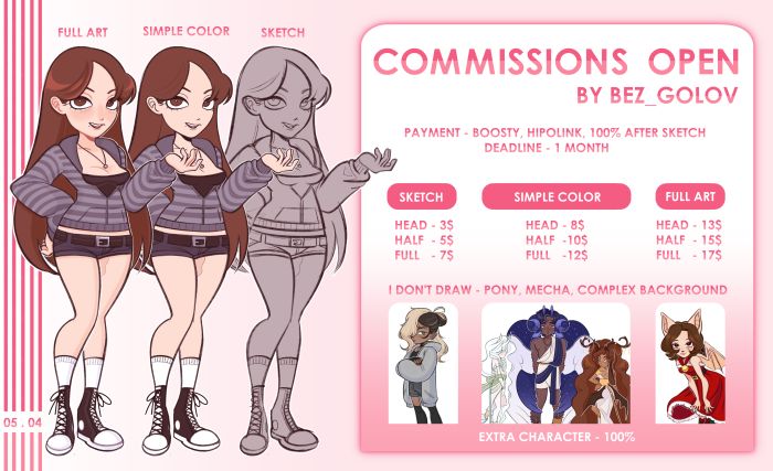PAYMENT ◦ Boosty (https://boosty.to/ericaalberich) ◦ Hipolink (https://hipolink.me/ericaalberich) ◦ Work after prepayment 100% PRICES ◦ Sketch - Head (3$) Half (5$) Full(7$) ◦ Simple color - Head (8$) Half (10$) Full(12$) ◦ Full art - Head (13$) Half (15$) Full(17$) DEADLINE ◦ 1 month CONTACT ◦ discord - undertaker6200