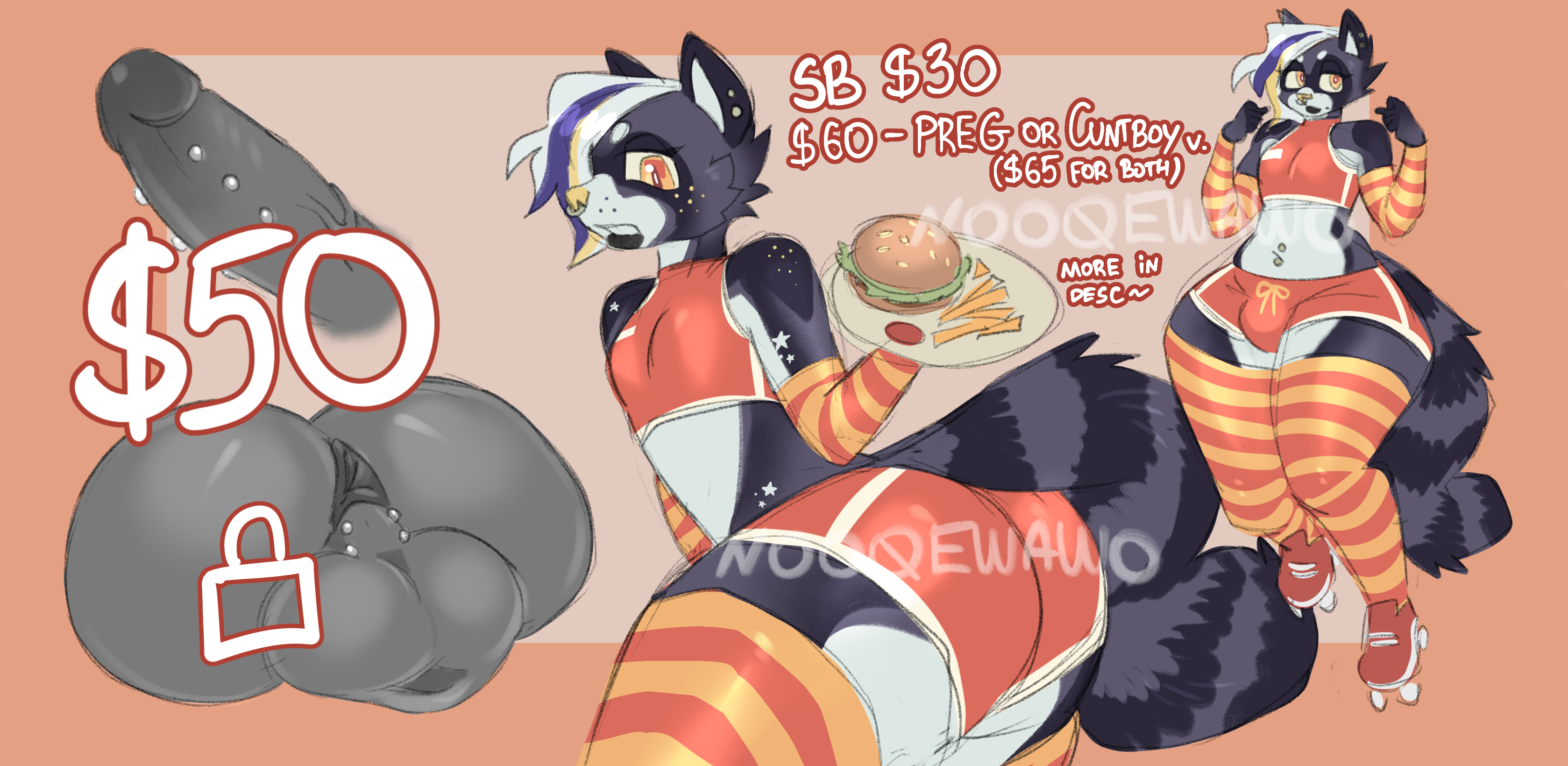 ‼️IF YOU DIDN’T ANSWER ME IN THREE DAYS AFTER AUCTION END I WILL CANCEL YOUR BID AND RESTART THE AUCTION ‼️ sb $30 mb $5 ab $200 + any changes & extras + commercial use $50 - ass and tongue extra $60 - cuntboy or preg ver ($65 for both) $70 - nude ver or another outfit ($85 for both) payment on boosty or hipolink (via card)