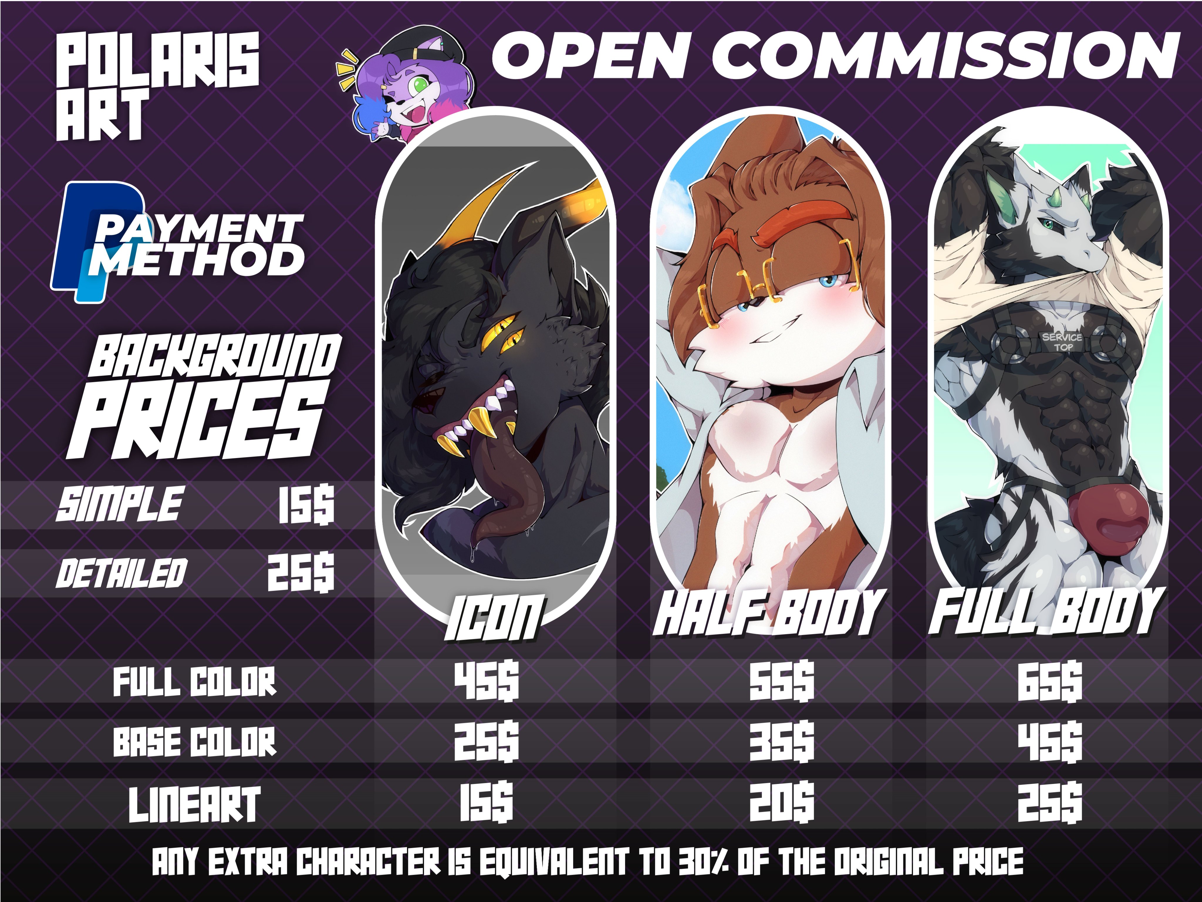 Icons 45$ Halfbodys: 55$ Fullbodys / NSFW: 65$ 2 character full color full body + background detailed: 109$ 鉁匢 DO: humans, anthro, nsfw, mobian, furry, and more my social network: https://linktr.ee/ArtPolaris