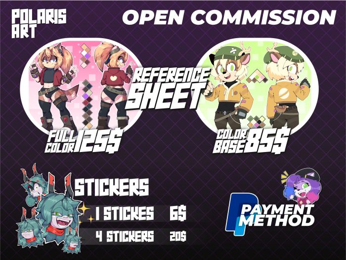 Reference sheet prices: Base color: 85$ Full color: 125$ Stickers: 1 x 6$ 4 x 20$ 鉁匢 DO: humans, anthro, nsfw, mobian, furry, and more my social network: https://linktr.ee/ArtPolaris