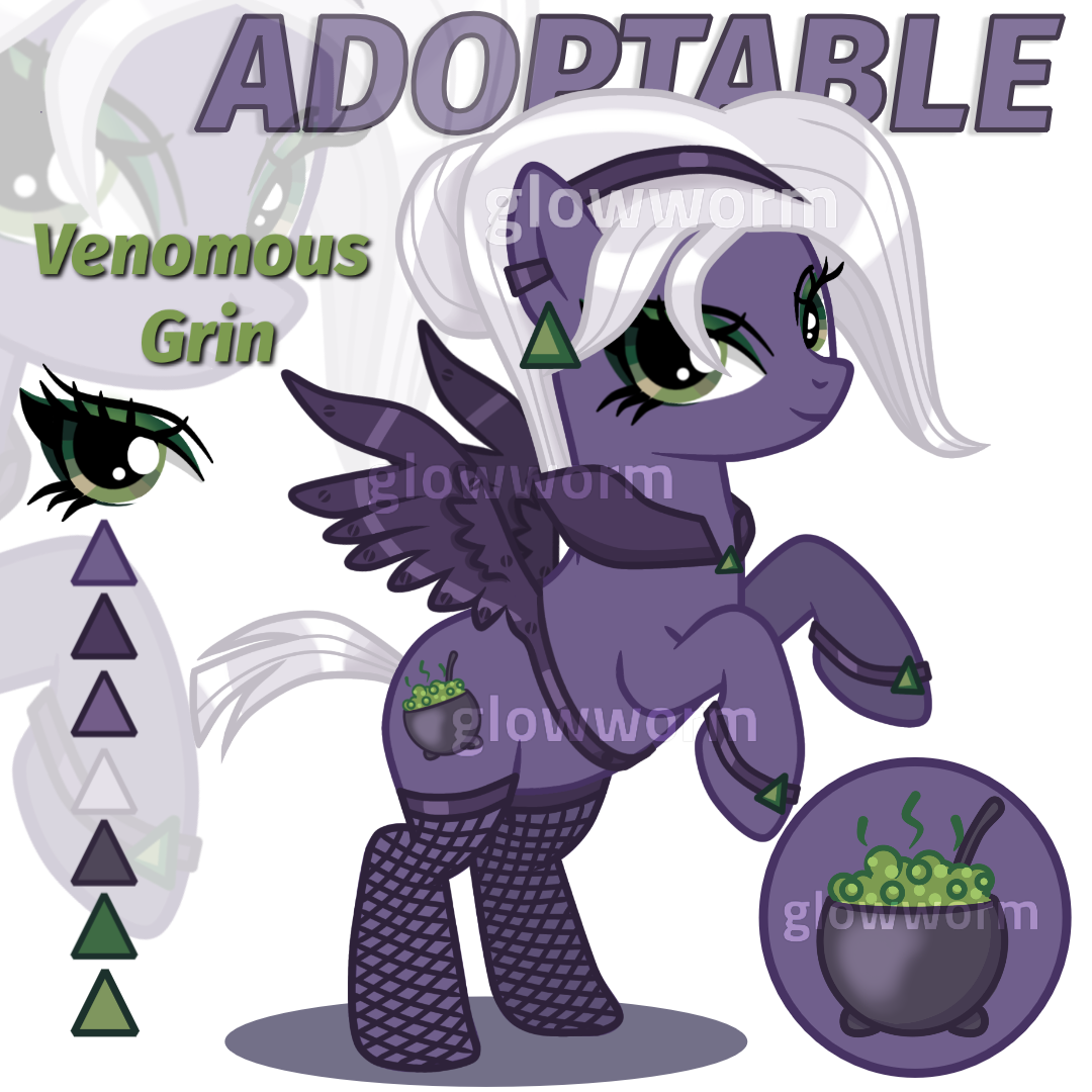 - SB: 13$ - MIN: 1$ - AB: - RULES: - full prepayment - You will receive full rights to the character, you can change the design, story, facts, etc. – You can resell the - character, but the price cannot be higher than the one you bought it for. - Please - make sure you can pay within 24 h. - No refunds. • Payment via PayPal only • • After purchase You: - Full ownership of the character; - Receive PNG files without watermarks (White, Transparent background); - Main Character View: A full-body view with clothing and accessories; - Detailed separate view of the Cutie Mark; • Also published on DeviantArt - DeviantArt link: https://www.deviantart.com/gloww0orm/art/OPEN-Pony-Adoption-Auction-Venomous-Grin-1320029286