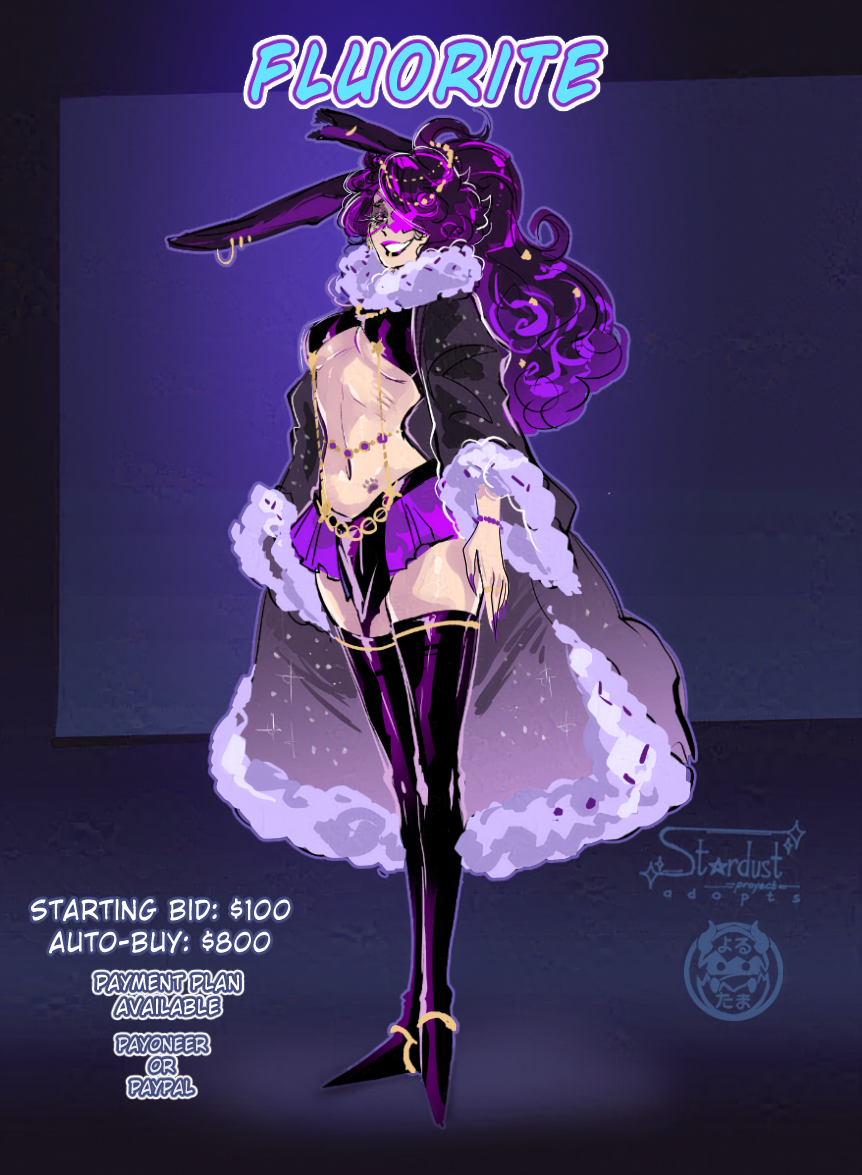 The Artist and Socials https://bsky.app/profile/yorutama.bsky.social x.com/StartdustV https://bsky.app/profile/stardustv.bsky.social To prevent sniping, bids near the end of the auction will extend after the most recent bid on that auction. Place your bids below, as replies to the relevant comment. Do not retract or delete bids under any circumstances. Doing so will result in a ban from all future auctions. Do not bid unless you are certain you want the character and will be able to afford to pay the amount you bid. If, despite all of that, you absolutely need to delete or remove a bid, please leave the bid intact and post a second comment explaining the situation. I'll sort things out from there. Because of the current situation the world is in, I want to state SPECIFICALLY that you are NOT allowed to use these designs in any blockchain (NFT and such) or AI training-related activities The starting bid is $100 Minimum bid increment is $10 AutoBuy is $800- Please include the number in an AB bid to confirm that you've actually read this. Payoneer and PayPal are available with a partial payment option