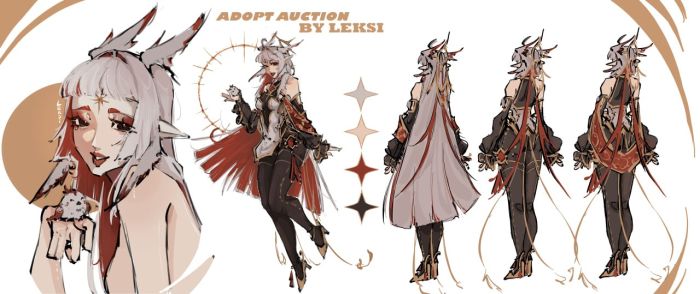 SB: $60 70$- Sketch art (bust) $80( version without clothes) 90$ - You will get a chibi version 100$- Art half body MB:5$ AB1: $150( Commercial law) AB2 250$ character sheet (It will feature: 1. Front view 2. Two back views 3. Naked view 4. Chibi version 5. Eyes Separate file Art that you can see in my profile, as well as half-body art from the auction image. ALSO: Additional half-body art, pose, and clothing of your choice. 18+ surcharge: $50) bid AB2 can beat bid AB1 with AB2 the auction ends instantly